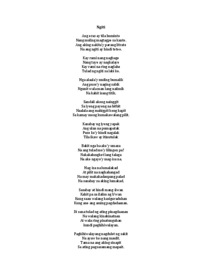 Hindi ka ba magtatagal. Patuloy na pumapatak Ang bawat sandaling natitira Habang ikay kapiling ko Siguro ngay maraming dahilan Kang maibibigay ngunit Ako ay may isang tanong. Dahil iba-iba ang wikang ginagamit sa ibat ibang lugar nagkakaiba rin ang paraan ng pagbuo ng salita ng mga naninirahan sa mga ito.