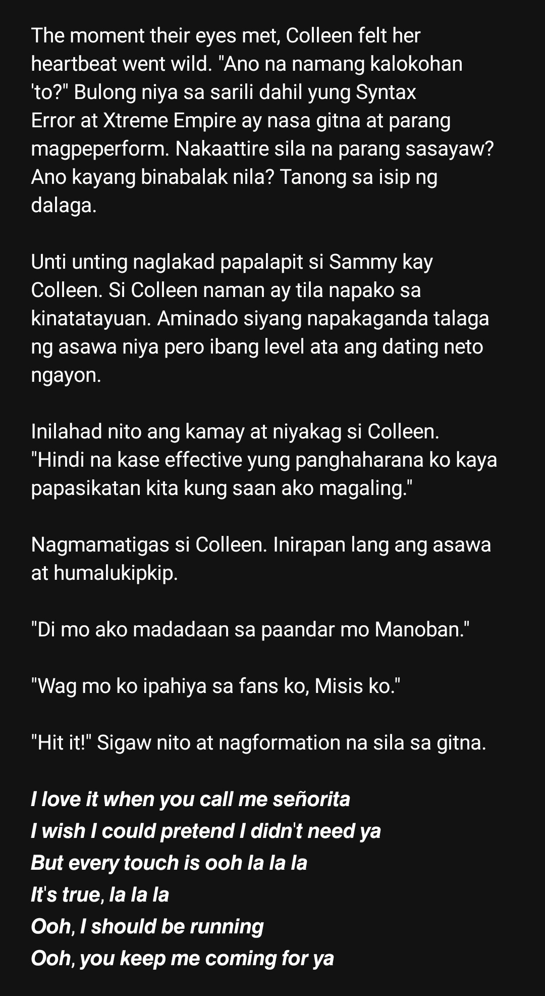 At maling oras natin nagdala Satin sa panahong nakatakda Nakaw na sandali Darating din ang tamang oras na para saatin muli kaya wag kang magmamadali Dahil akoy narito narito narito lang ako Hindi ako nalito nalito narito lang ako Kaya wag magmadali Gustong kasama ka lagi Kaso lang hindi maaari Kase nga iba ang may ari Ako ang nakikihati. Lagi nalang ako nakikihati ng oras m. Give me a chance.